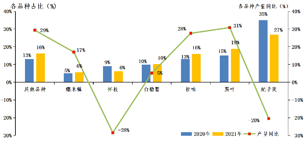 今年广东荔枝以妃子笑、黑叶、桂味、白糖罂、怀枝、糯米糍六大品种为主,其中优质品种桂味、糯米糍占比分别较2020年提升3%和1%。仙进奉、岭丰糯、凤山红灯笼等其他优质特色品种也逐步扩大推广面积,占比较2020年提升3%。