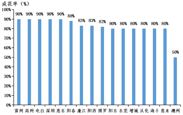 荔枝成花、坐果情况优。去年9月以来,雨水偏少,加之年初低温天气影响,对荔枝成花有促进作用,荔枝坐果优良。据省农业信息监测体系数据,预计今年我省荔枝种植面积约为410万亩,荔枝总产量140万吨,同比增长3.7%,平均单产341公斤,同比基本持平。其中粤西产区荔枝产量预计为98万吨,占全省70%;珠三角产区荔枝产量约占全省14%;粤东产区产量约占全省16%。