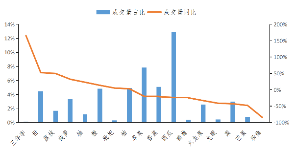 从主要监测品种来看,今年上半年成交量增幅较大的水果品种有三华李、柑、荔枝、菠萝、柚,同比分别增长165.6%、52.6%、49.9%、32.1%和23.0%;同比降幅较大的水果品种主要是杨梅、芒果、梨、龙眼、火龙果,分别同比下降84.5%、47.9%、42.7%、41.2%和33.1%。
