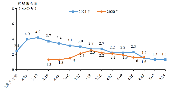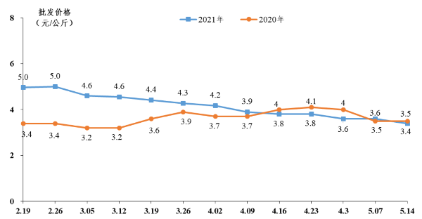 菠萝行情同比提升。据省农业信息监测体系数据,徐闻县本季巴厘菠萝田头均价2.5元/公斤,同比增长25.6%,其中2月田头均价达到4.0-5.2元/公斤,位于历史高位,5月菠萝上市量超95%,进入采摘后期,田头均价仍维持约1.4元/公斤。雷州市本上市季巴厘菠萝田头均价2.4元/公斤,同比增长14.3%;中山市神湾镇于4月开始上市,5月神湾菠萝销售均价16.0元/公斤,同比基本持平。