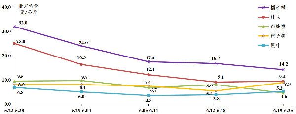 荔枝批发行情同比下降。受荔枝上市量增加和上市期集中的影响,批发行情同比下降。据省农业信息监测体系数据,今年省内主要批发市场荔枝批发均价10.8元/公斤,同比下降5.3%。其中妃子笑、白糖罂、桂味、黑叶和糯米糍省内批发均价分别为7.8元/公斤、9.2元/公斤、11.4元/公斤、5.0元/公斤和14.6元/公斤。