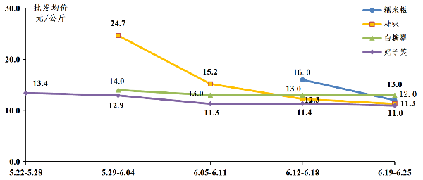 从全国市场批发行情来看,全国主要批发市场荔枝批发均价为12.5元/公斤,同比下降26.5%。其中妃子笑、白糖罂、桂味和糯米糍省外批发均价分别为12.0元/公斤、13.3元/公斤、15.9元/公斤和14.0元/公斤。