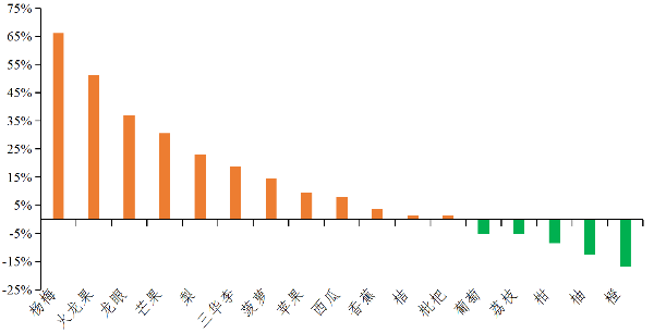 水果批发价格以涨为主。上半年在各级政府及企业市场推介活动大力推动下,市场购销活跃,批发价格以涨为主,除荔枝、橙、柚、柑和葡萄同比下降之外,其他水果价格均上涨。杨梅、火龙果、龙眼、芒果、梨等品种上涨幅度均超过20%。