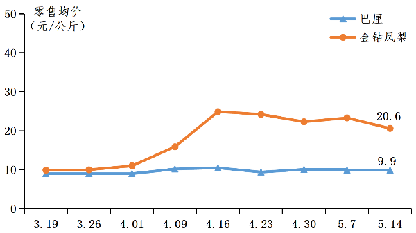 菠萝零售行情稳定。据省农业信息监测体系数据,主要监测品种巴厘菠萝上市期间零售价格稳定,均价为9.9元/公斤,金钻凤梨集中上市期零售价格较好,均价为23.3元/公斤。