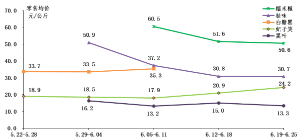 荔枝零售行情稳定。据省农业信息监测体系数据,各零售平台荔枝销售品种有所不同,平台定价波动较小,上半年荔枝零售行情基本保持稳定。主要零售平台妃子笑、白糖罂、桂味、黑叶和糯米糍零售均价分别为19.8元/公斤、34.1元/公斤、36.9元/公斤、14.3元/公斤和52.5元/公斤。