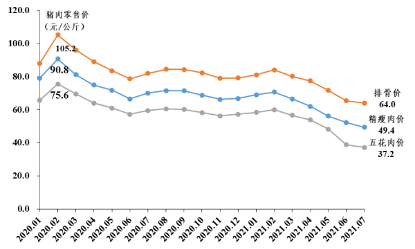 猪肉零售价相应下降,据地市“菜篮子”价格数据,排骨均价、精瘦肉均价和五花肉均价分别降至64.0元/公斤、49.4元/公斤和37.2元/公斤,环比分别下降2.1%、5.5%和4.4%,同比均下降10%以上。