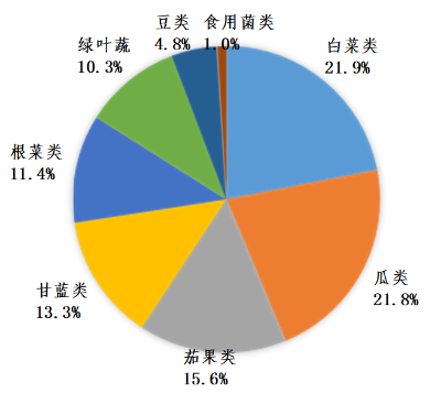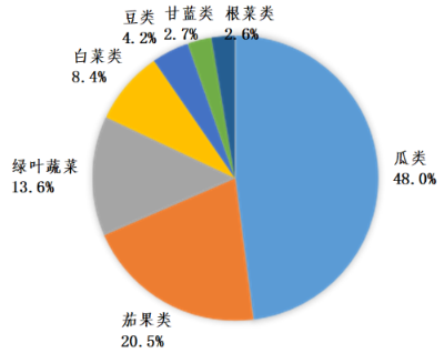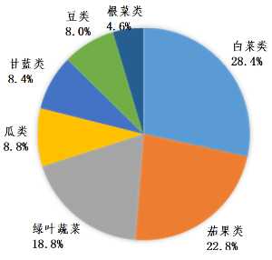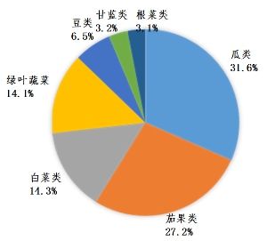 采收面积略增。我省菜篮子基地25种大宗蔬菜采收面积环比小幅增长0.4%;与去年同期相比,采收面积下降4.6%。采收面积排名前三的是瓜类、茄果类和白菜类蔬菜,面积占比分别为31.6%、27.2%和14.3%,其中苦瓜、茄子和菜心采收面积占比分别是10.5%、8.5%和7.9%。