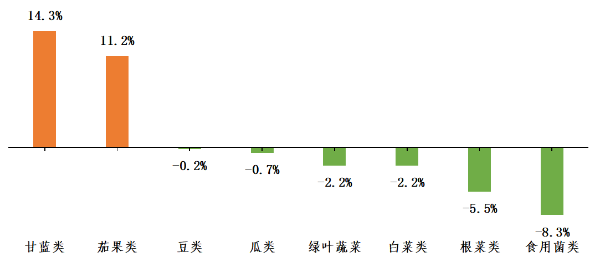 与6月相比,省外甘蓝类和茄果类蔬菜供给增加,其市场交易量明显增加,环比分别增长14.3%和11.2%。交易量减幅较大的是食用菌类和根菜类,环比下降幅度均在5.0%以上;白菜类和绿叶蔬菜类交易量环比均下降2.2%;瓜类和豆类蔬菜交易量小幅减少,环比分别下降0.7%和0.2%。