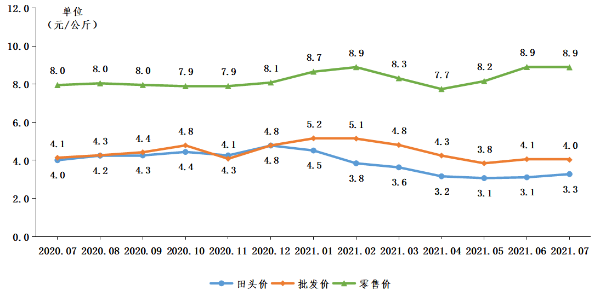 7月省内外降雨频繁,但蔬菜总体供给充足,价格小幅波动。据省农业信息监测体系数据,监测的25种大宗蔬菜加权田头价3.3元/公斤,环比上涨5.4%、同比下跌18.2%;加权批发价4.0元/公斤,环比下跌0.8%,同比下跌2.6%;零售均价8.9元/公斤,环比微跌0.1%,同比上涨11.7%。