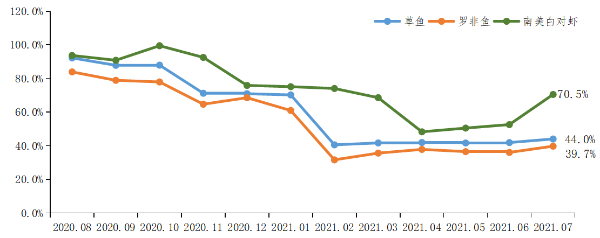 罗非鱼出塘量增加。为减少养殖密度,避免高温环境下罗非鱼发生链球菌病,养殖基地加快出塘;且华南港口运力恢复后加工厂为及时交付订单增加原料收购,双重拉动罗非鱼出塘增加。据省农业信息监测体系数据,7月基地罗非鱼出塘量环比增加103.8%,出塘量定基指数为535.4%,较6月增加272.7个百分点。