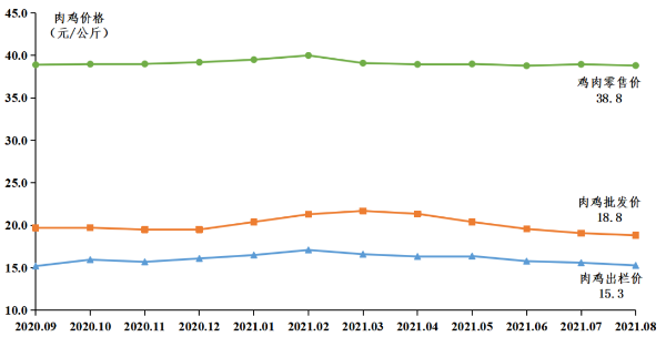 肉鸡价格下跌。终端市场受疫情影响,各酒楼餐饮对肉鸡的消费需求减少,加之猪价持续低位,肉鸡价格整体下跌。据省农业信息监测体系数据,本月我省肉鸡出栏价为15.3元/公斤,环比下降2.0%,同比增长17.9%;肉鸡市场批发价为18.8元/公斤,环比下降1.3%,同比下降2.2%;据地市“菜篮子”价格数据,白条鸡零售价为38.8元/公斤,环比下降0.4%,同比下降1.4%。据基点县监测数据,我省博罗、惠阳和台山等县区肉鸡市场零售价分别为44.0元/公斤、33.0元/公斤和41.0元/公斤。