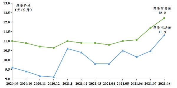 蛋价上涨。当前临近中秋,正值月饼备货时期,加工厂向基地采购禽蛋量增加,鸡蛋行情上涨。据省农业信息监测体系数据,本月我省自产鸡蛋出场价为11.3元/公斤,环比增长8.1%,同比增长24.3%;据地市“菜篮子”价格数据,鸡蛋零售价格为12.2元/公斤,环比增长4.5%,同比增长11.1%。据基点县监测数据,我省新兴、清新、博罗、惠阳和台山等县区鸡蛋市场零售价分别为12.0元/公斤、11.0元/公斤、16.0元/公斤、11.0元/公斤和13.0元/公斤。