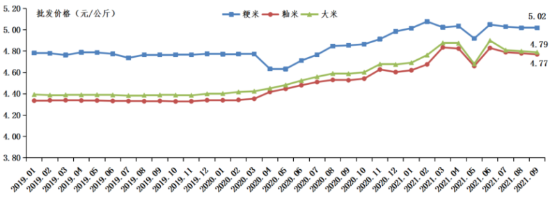 批发市场大米价格环比下降。据省农业信息监测体系数据,9月大米批发均价为4.79元/公斤,环比略降0.2%,同比上涨4.6%;其中籼米批发价格为4.77元/公斤,环比略降0.2%,同比上涨4.6%;粳米批发价格为5.02元/公斤,环比下降0.2%,同比上涨3.5%。