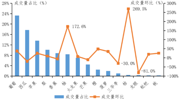 批发市场水果成交量增加。9月份水果处于季节性供给高峰,恰逢中秋佳节,批发市场成交量增加。据省农业信息监测体系数据,批发市场水果总成交量环比增加9.3%,省内主要批发市场成交量占比前三的水果是葡萄、西瓜和苹果,占比分别为23.3%、17.8%和13.6%。柚和桔的成交量增幅较大,其中云南和江西蜜桔上市,带动桔类成交量环比增加269.5%;广东蜜柚迎来上市季节,柚类成交量环比增加172.6%;龙眼和三华李的成交量降幅较大,环比分别下降81.0%和30.0%;香蕉的成交量环比下降6.0%。