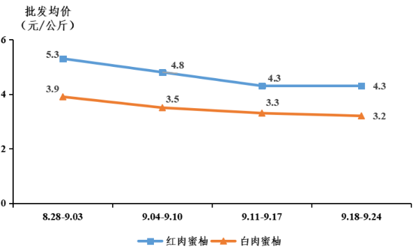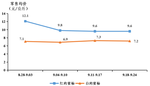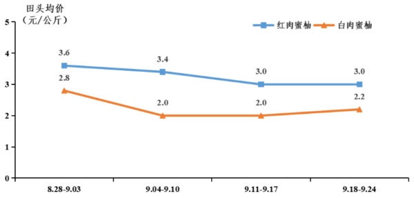 蜜柚零售行情下降。据省农业信息监测体系数据,9月商超和社区门店等零售平台蜜柚销售均价为9.1元/公斤,环比下降21.6%,其中红肉蜜柚销售均价为10.1元/公斤,环比下降23.3%,白肉蜜柚销售均价为7.2元/公斤,环比下降3.1%。