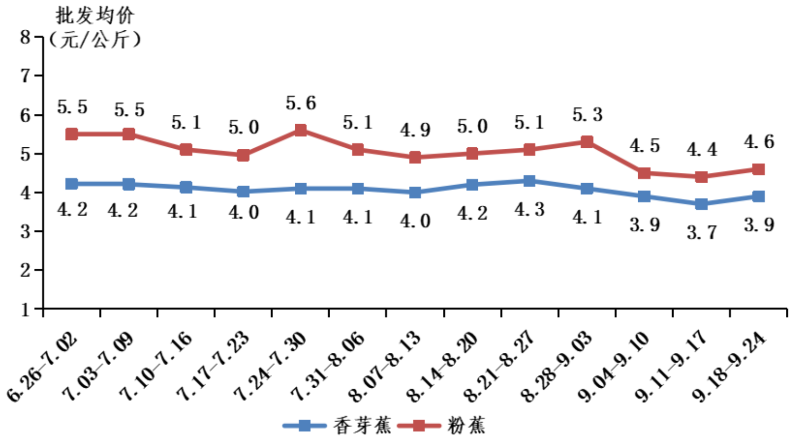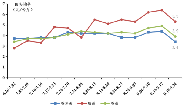 香蕉田头整体行情下降。因广东、广西、海南三产区香蕉同时上市,导致香蕉田头行情下降。据省农业信息监测体系数据,本月规模化示范基地香蕉均价为4.3元/公斤,环比基本持平,其中香芽蕉田头均价为3.9元/公斤,环比下降6.6%,粉蕉田头均价为5.8元/公斤,环比上升8.8%。