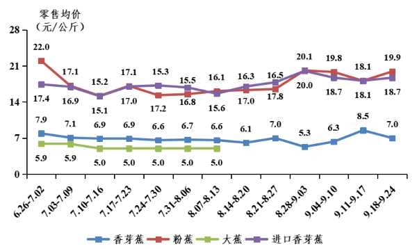 香蕉零售行情上涨。9月恰逢中秋且临近国庆,香蕉零售行情上升。据省农业信息监测体系数据,主要零售平台香芽蕉、粉蕉和进口蕉零售均价分别为6.9元/公斤、19.4元/公斤和18.7元/公斤,环比分别上升4.7%、15.5%和9.6%。