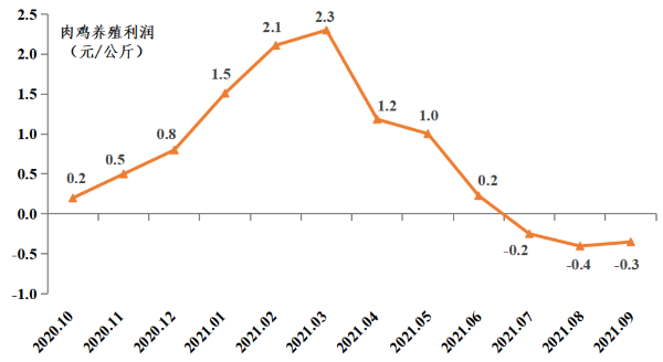 家禽养殖成本上涨,养殖亏损。因饲料原料价格高涨,养殖成本增加。据省农业信息监测体系数据,第三季度肉鸡养殖成本为26.1元/只,环比增长4.0%,同比增长17.3%,其中饲料成本为18.5元/只,环比增长5.0%,同比增长20.8%。肉鸡养殖利润由盈转亏,第三季度亏损2.0%。