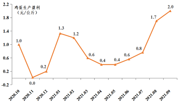 蛋禽饲料成本增加,鸡蛋保持盈利。饲料原料价格居高不下,但鸡蛋仍保持盈利。据省农业信息监测体系数据,第三季度鸡蛋生产成本为9.2元/公斤,环比增长1.5%,同比增长19.5%,其中饲料成本为6.1元/公斤,环比增长3.0%,同比增长6.9%。鸡蛋生产保持盈利,利润率为13.9%,比第二季度增加9.1个百分点。