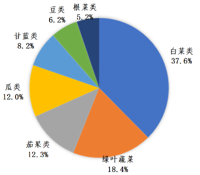新增种植面积占比较大的是白菜类、绿叶蔬菜、茄果类和瓜类蔬菜,面积占比分别是37.6%、18.4%、12.3%和12.0%。新增种植面积排名前五的是菜心、大白菜、豇豆、小白菜和生菜,面积占比分别是25.7%、6.1%、6.1%、5.8%和5.8%。