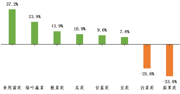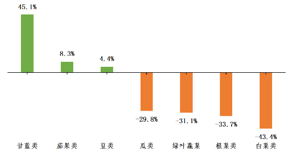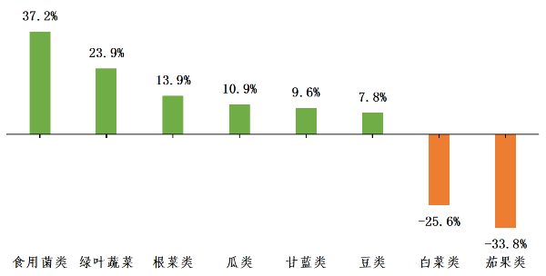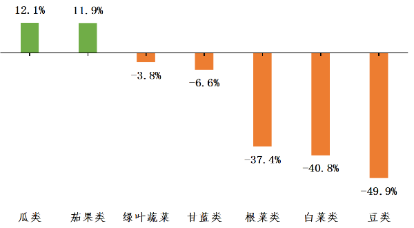 与去年同期相比,第三季度蔬菜产量普遍减少,其中豆类、白菜类和根菜类蔬菜产量明显下降,同比下降幅度均在30%以上,甘蓝类和绿叶蔬菜同比分别下降6.6%和3.8%。产量增加的是瓜类和茄果类,同比分别增长12.1%和11.9%。