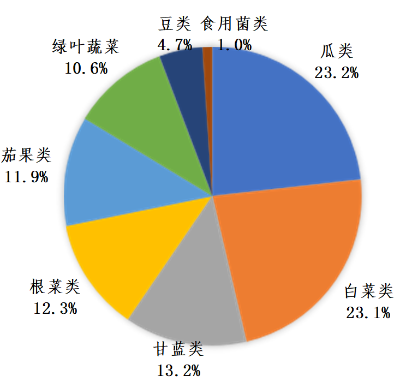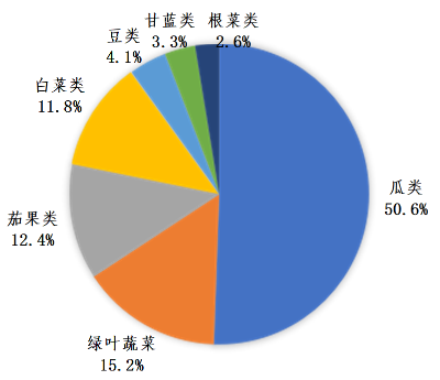 蔬菜产量同比减少。据省农业信息体系监测数据,监测的25种大宗蔬菜产量同比下降7.2%。产量占比较大的是瓜类、绿叶蔬菜、茄果类和白菜类,占比分别为50.6%、15.2%、12.4%和11.8%。产量排名前五的是苦瓜、丝瓜、茄子、菜心和冬瓜,占比分别是21.1%、14.5%、7.9%、6.7%和6.5%。
