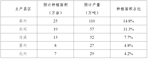 本季香蕉进入上市高峰期,香蕉供应充足。2021年各主产县区中种植面积排名前5的县区分别为高州、徐闻、遂溪、雷州及化州,预计种植总面积72万亩,占全省种植总面积的42%;总产量275万吨,占全省产量的53.3%。其中,高州预计产量110万吨,每年香蕉亩产新增产量10%,一级蕉率达到92%,高州市香蕉产业园成功入选第一批省级特色产业现代农业产业园推荐名单。