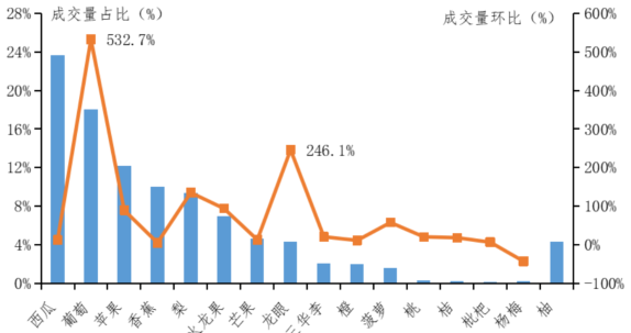 第三季度市场主要水果品种成交量占比与同比