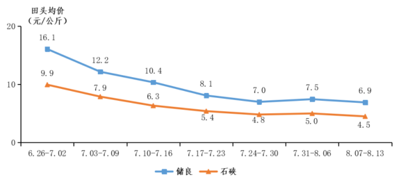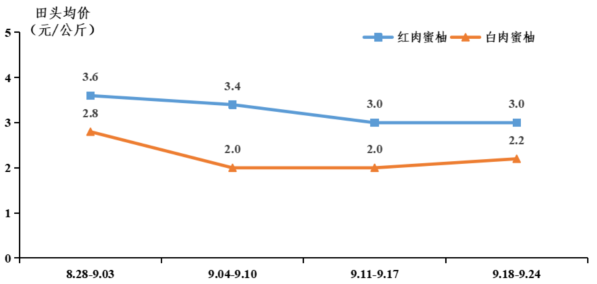 蜜柚上市基本收尾,田头行情下降。据省农业信息监测体系数据,本季蜜柚出口果品于8月采摘,国内供应采摘周期约20天,从9月3日持续到中秋节;上市周期约30天,从9月3日持续到中秋节后一周,较2020年缩短7天左右。本季蜜柚田头均价为3.2元/公斤,其中红肉蜜柚田头
