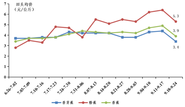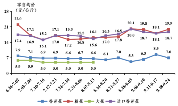 香蕉零售行情上涨。据省农业信息监测体系数据,本季商超和社区门店等零售平台香蕉行情上涨,主要社区零售及商超等平台7月香蕉销售均价为15.3元/公斤,8月为15.6元/公斤,环比增长2.0%;9月为17.2元/公斤。