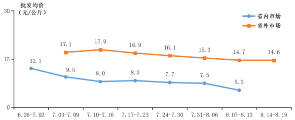 龙眼批发行情下降。从全国批发市场行情来看,广东龙眼上市季行情呈下降趋势,本季省内市场龙眼批发均价7.3元/公斤,其中储良批发均价9.8元/公斤,石硖批发均价6.4元/公斤。7月龙眼批发均价8.4元/公斤,同比下降22.2%;8月龙眼批发均价6.3元/公斤,同比下降50.2%。本季省外市场龙眼批发均价为14.9元/公斤。
