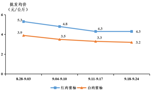 蜜柚批发行情下降。从全国批发市场行情来看,广东蜜柚上市季行情呈下降趋势。据省农业信息监测体系数据,9月省内主要批发市场蜜柚批发均价为4.1元/公斤,同比下降13.7%;其中红肉蜜柚批发均价为4.5元/公斤,白肉蜜柚批发均价为3.4元/公斤。省外批发市场蜜柚批发均价为4.4元/公斤。
