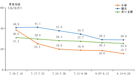 龙眼零售行情下降。据省农业信息监测体系数据,本季商超和社区门店等零售平台龙眼行情下降,主要社区零售及商超等平台7月龙眼销售均价为30.3元/公斤,8月为24.9元/公斤,环比下降17.6%;其中储良龙眼本季销售均价为33.1元/公斤,石硖龙眼本季销售均价为21.2元/公斤,进口龙眼本季销售均价为28.0元/公斤。