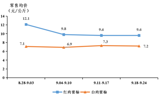蜜柚零售行情下降。据省农业信息监测体系数据,9月商超和社区门店等零售平台蜜柚销售均价为9.1元/公斤,环比下降21.6%;其中红肉蜜柚销售均价为10.1元/公斤,环比下降23.3%,白肉蜜柚销售均价为7.2元/公斤,环比下降3.1%。