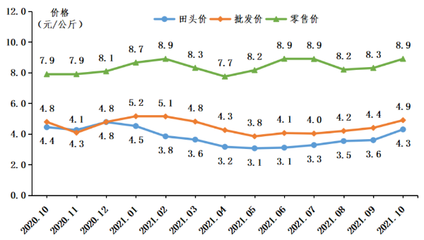 10月受海南台风及部分地区强降雨等极端天气以及生产流通的人工、肥料、能源费用上涨影响,蔬菜生产成本上涨且供给减少,同时降温天气带来了消费需求的增加,导致我省蔬菜价格有较大幅度上涨。据省农业信息监测体系数据,监测的25种大宗蔬菜田头均价为4.3元/公斤,环比上涨18.1%,同比下跌3.3%;批发均价为4.9元/公斤,环比上涨11.4%,同比上涨2.4%%;零售均价为8.9元/公斤,环比上涨7.5%,同比上涨12.7%。