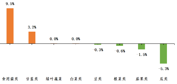 市场食用菌类和甘蓝类蔬菜交易量增加,交易量环比分别增长9.5%和3.2%。白菜类、绿叶蔬菜交易量与9月保持一致,环比持平。豆类、根菜类、茄果类和瓜类蔬菜交易量下降,环比分别下降0.3%、0.6%、1.5%和5.3%。