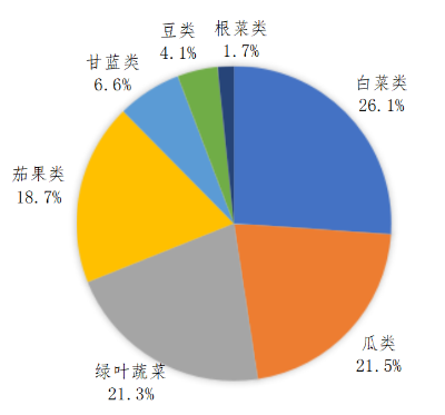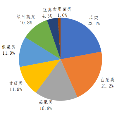 蔬菜产量小幅减少。受季节生产影响,10月瓜类蔬菜已到上市尾期,产出明显减少,但白菜类等蔬菜产量增加,总体而言,蔬菜产量小幅下降。监测的25种大宗蔬菜产量环比略降0.3%,预计全省蔬菜产量68.4万吨,同比下降1.6%。分种类而言,产量排名前三的是白菜类、瓜类和绿叶蔬菜类,产量占比分别为26.1%、21.5%和21.3%。
