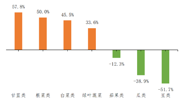 10月气候渐凉,各基地换茬种植耐寒蔬菜,其中甘蓝类、根菜类和白菜类蔬菜新种植面积增加明显,环比分别增长71.3%、63.0%和52.0%。新种植面积减少的是茄果类、瓜类和绿叶蔬菜类,其中茄果类下降幅度较大,环比下降60.8%、瓜类环比下降25.3%、绿叶蔬菜环比下降15.0%。