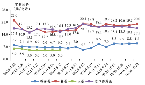 国产香蕉零售行情上涨。受台风“圆规”及冷空气影响,下游消费市场香蕉价格总体呈现较快上涨。据省农业信息监测体系数据,主要零售平台香芽蕉、粉蕉零售均价分别为8.9元/公斤和19.6元/公斤,环比分别增加23.3%和1.8%。进口香芽蕉零售均价17.8元/公斤,环比下降4.8%。