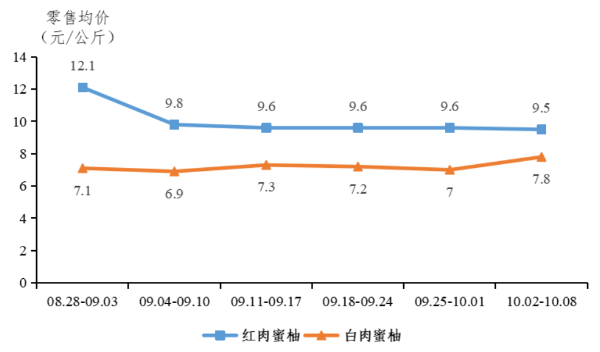 蜜柚零售行情稳定。据省农业信息监测体系数据,2021年主要社区零售及商超等平台蜜柚销售均价为9.1元/公斤,其中红肉蜜柚零售均价为10.1元/公斤,白肉蜜柚零售均价为7.3元/公斤。