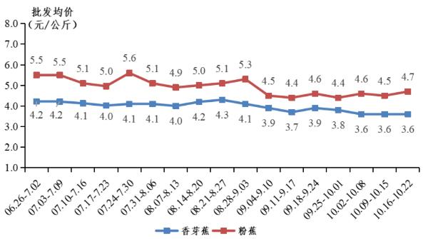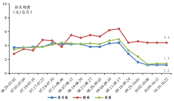香蕉田头行情下降,中旬探底回升。中秋节后,香蕉需求量下降,加之10月上旬持续高温,香蕉成熟速度加快,品质下降,过熟蕉急于售出,导致香蕉田头行情下降,中下旬虽受冷空气温度下降及上市量总体减少影响,价格回升,但总体仍下降。据省农业信息监测体系数据,本月规模化示范基地香蕉均价为1.4元/公斤,其中香芽蕉田头均价为1.2元/公斤,环比下降68.2%,粉蕉田头均价为4.4元/公斤,环比下降18.6%。当前主要上市产区中,阳江地区大宗香芽蕉收购价为1.0-1.5元/公斤,南沙区大宗香芽蕉收购价为1.2-1.6元/公斤,博罗县香芽蕉大宗收购价为1.1-1.5元/公斤。