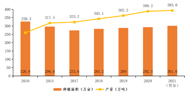 2021年广东柑橘种植面积和产量走势图