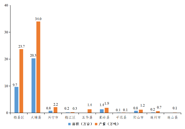 2021年广东省蜜柚主产县区蜜柚种植面积和产量