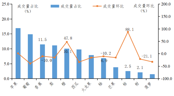 广东主要批发市场各种类水果成交量占比与环比图