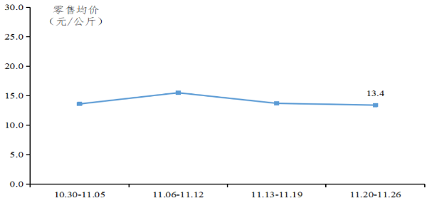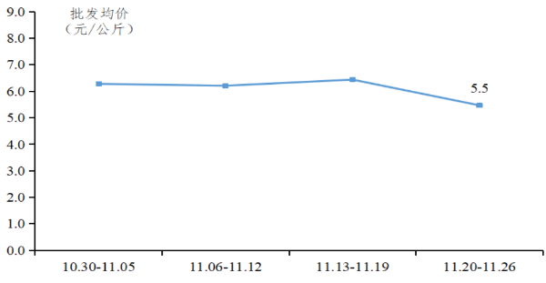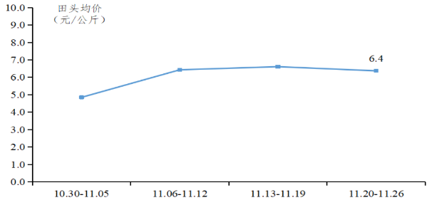 沙田柚行情同比上涨。本季沙田柚预售情况良好,订单量较多,行情向好。据省农业信息监测体系数据,部分规模化企业订单量超5成,1.7斤以上好果预定价格超5.0元/公斤。沙田柚月初开始采摘上市,开局行情高涨,至中下旬行情稳定在6.4-6.6元/公斤,11月规模化基地沙田柚田头均价为6.4元/公斤,同比增长24.0%。
