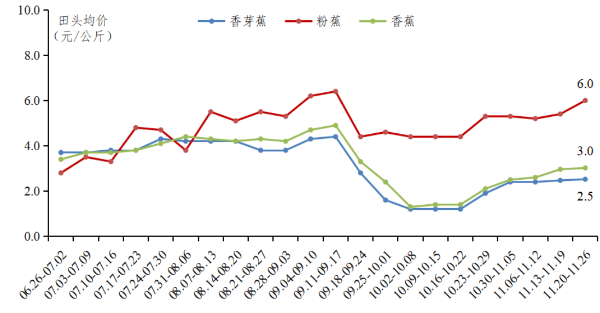 香蕉田头行情高涨。11月香蕉供应处于新老蕉交替生长阶段,供应偏少,叠加两场寒潮影响,香蕉成熟速度减缓,供应量再度减少,同时北方应季水果减少,香蕉需求增加,带动行情上涨。据省农业信息监测体系数据,11月规模化示范基地香蕉均价为2.7元/公斤,其中香芽蕉田头均价为2.4元/公斤,环比上涨84.7%,粉蕉田头均价为5.5元/公斤,环比上涨18.7%。