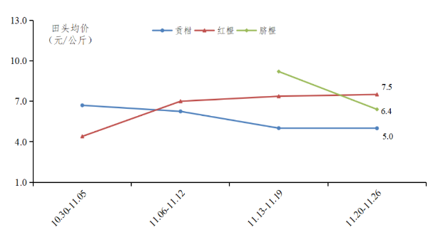 柑橘开市行情处于高位,后期价格回落,趋于稳定。开采节期间贡柑和脐橙价格处于高位,后受省内外柑橘供应增加影响,价格有所回落,但总体价格较去年同期稳定。据省农业信息监测体系数据,本月规模化柑橘生产基地贡柑田头均价为5.9元/公斤,脐橙田头均价为8.9元/公斤。红橙从开市以来保持稳定上升趋势,本月红橙田头均价为6.9元/公斤。