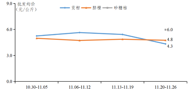 柑橘正式开采上市,供应持续增长。11月中旬,广东省各柑橘主产区产销活动接连不断,10日、11日、13日、19日,仁化、德庆、廉江、平远纷纷举办贡柑、红橙、脐橙产销对接会,各产地柑橘正式开采上市。下旬,柑橘市场供应量持续增长,月末德庆贡柑上市进度约3成。