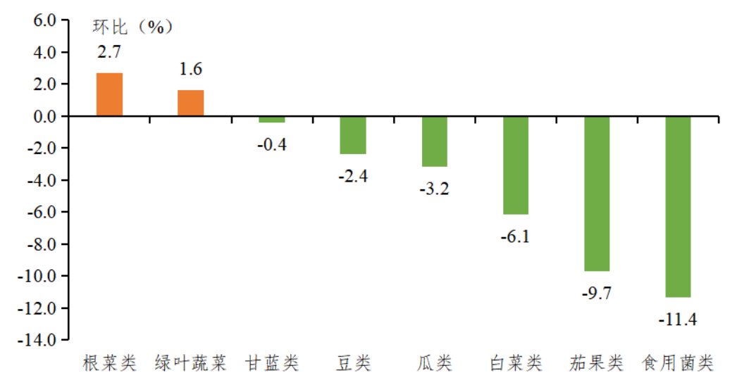 市场根菜类和绿叶蔬菜成交量增加,成交量环比分别增长2.7%和1.6%。成交量明显减少的是食用菌类、茄果类和白菜类,环比下降幅度均在5%以上;瓜类、豆类和甘蓝类成交量小幅减少,环比分别下降3.2%、2.4%和0.4%。