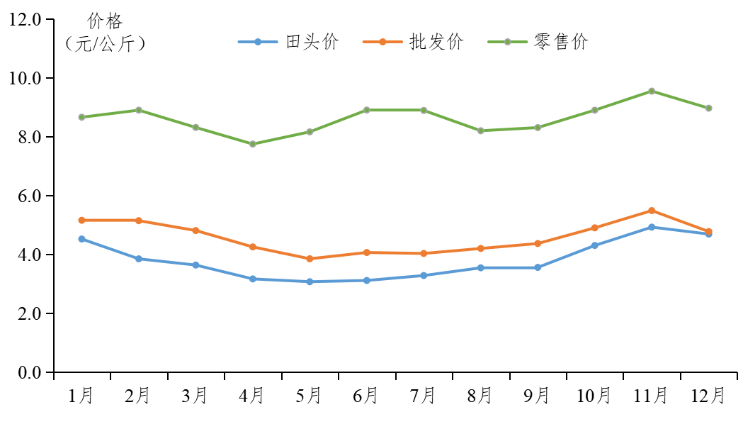12月蔬菜价格整体较上月下跌,据省农业信息监测体系数据,25种大宗蔬菜田头均价为4.69元/公斤,较上月下跌0.24元/公斤,环比下跌4.80%,同比下跌1.93%;批发均价为4.77元/公斤,较上月下跌0.71元/公斤,环比下跌12.99%,同比下跌0.26%;零售均价为8.97元/公斤,较上月下跌0.58元/公斤,环比下跌6.07%,同比上涨10.85%。